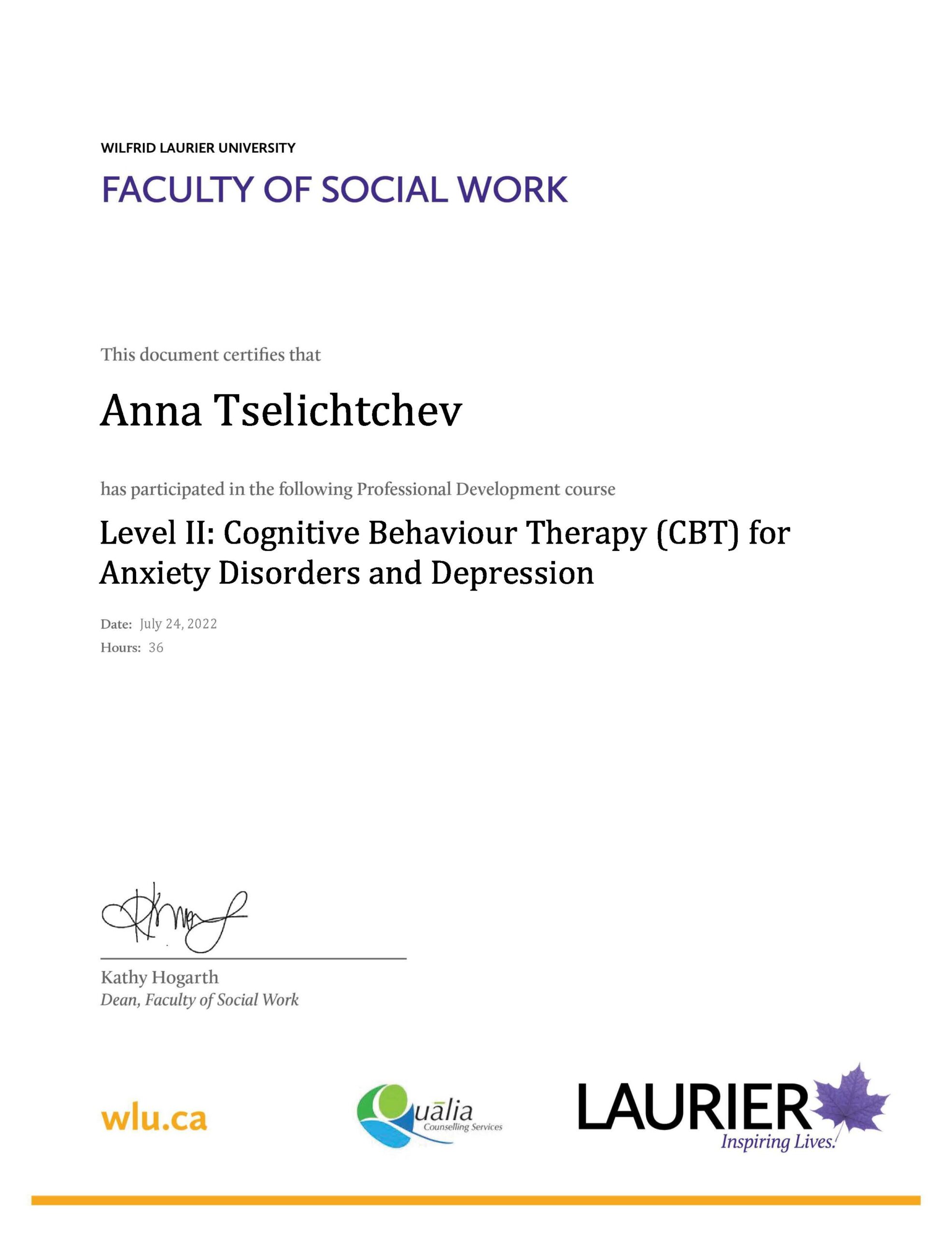 - CBT & Addictions Certificates – Wilfrid Laurier University (2022)