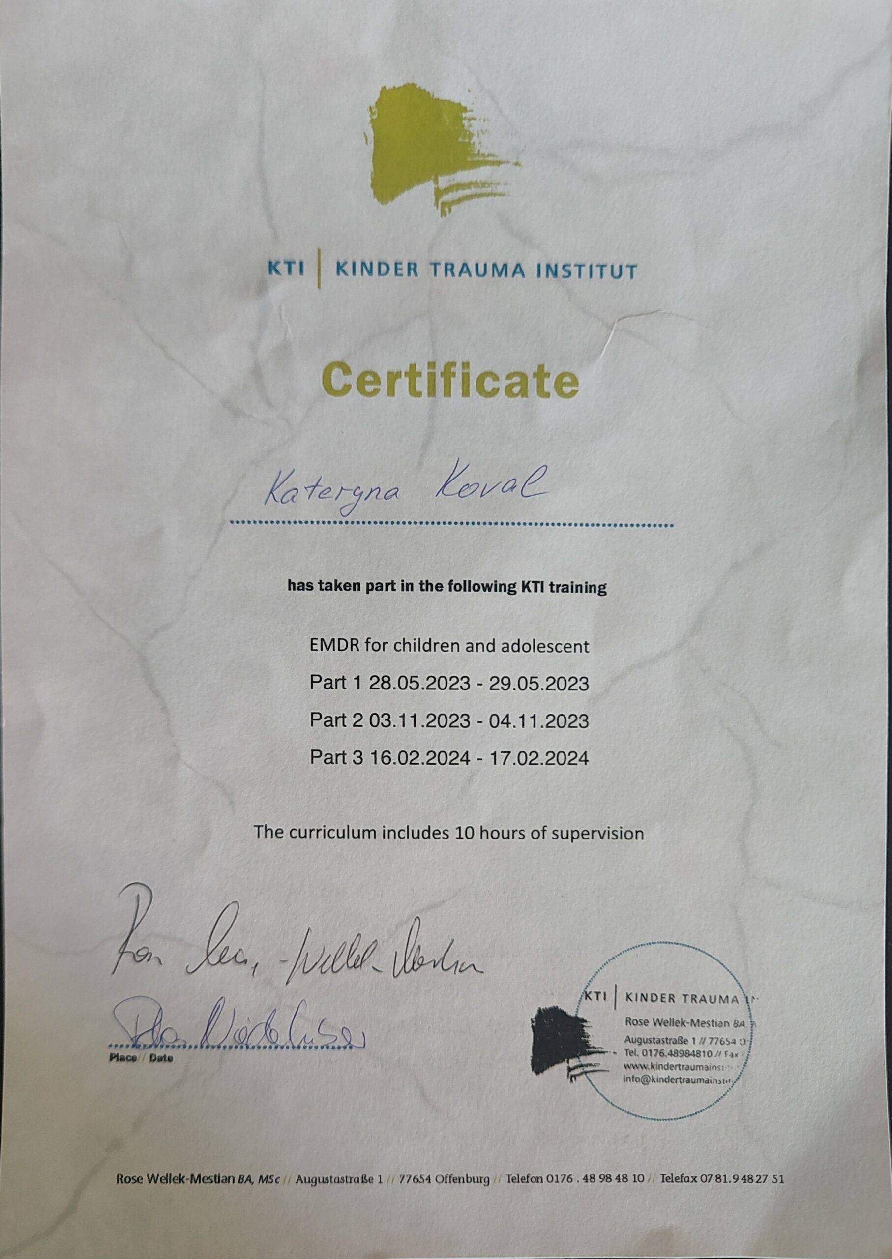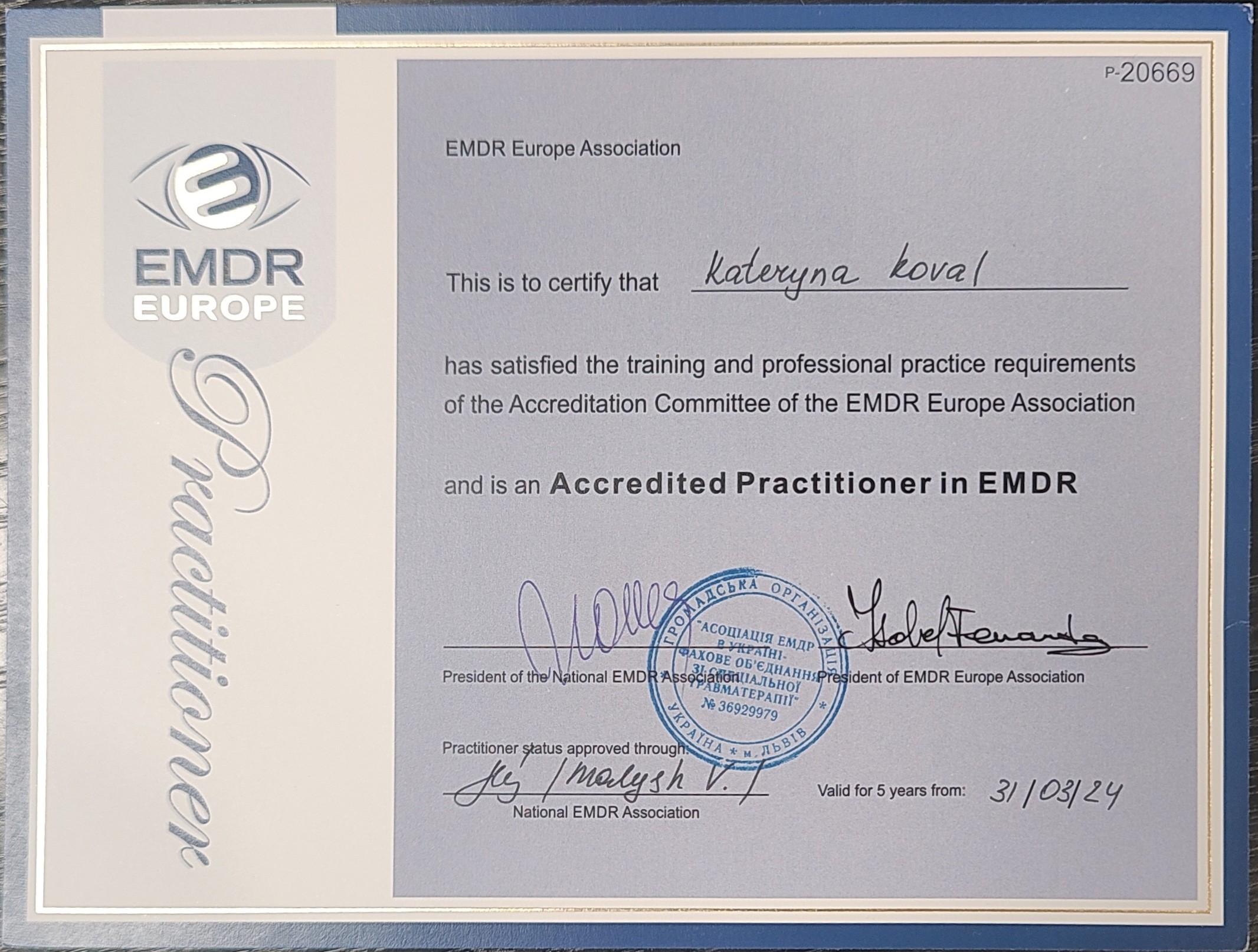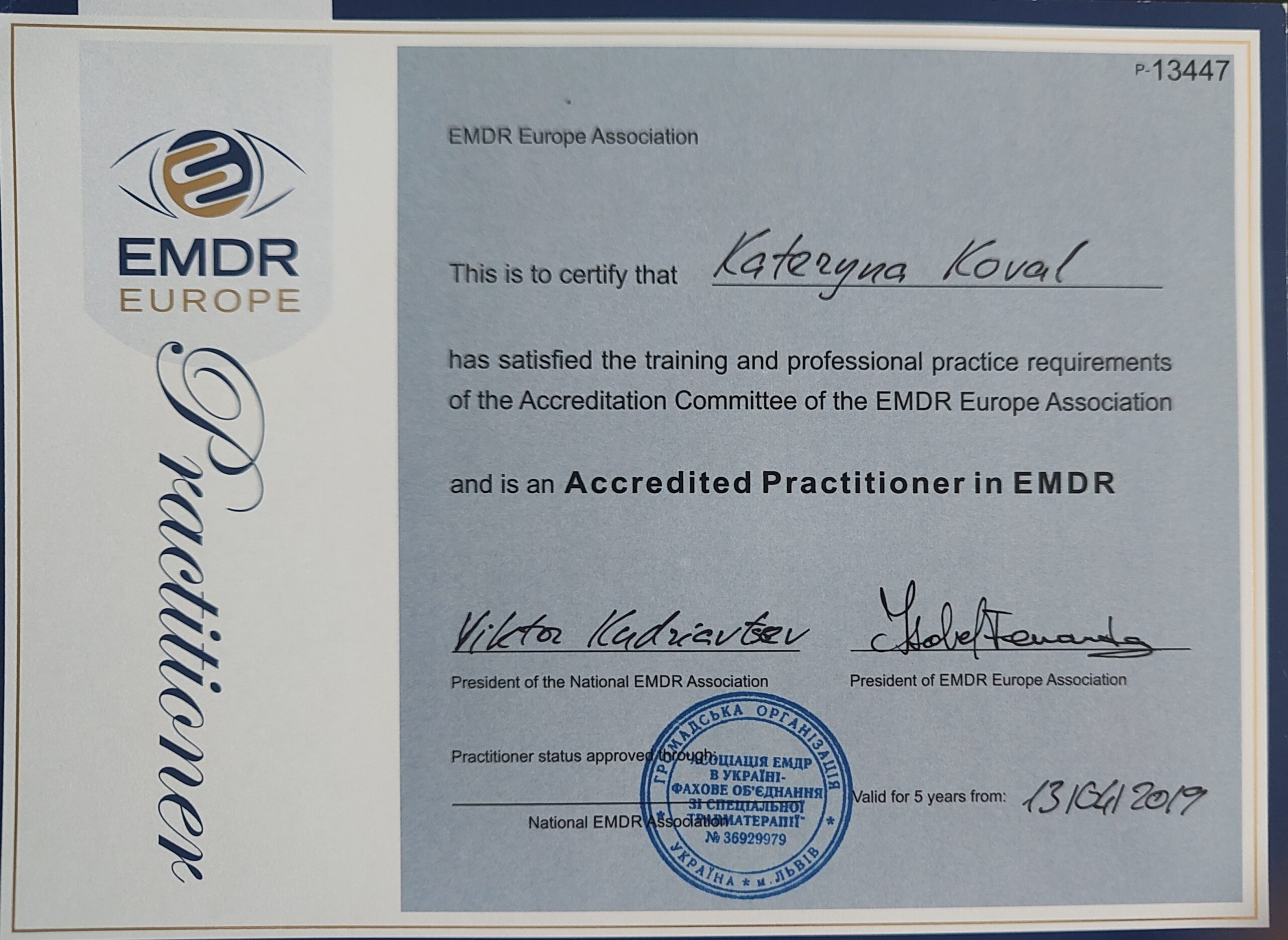 - Certified Trauma Therapist for Children & Adults (EMDR Ukraine), 2019