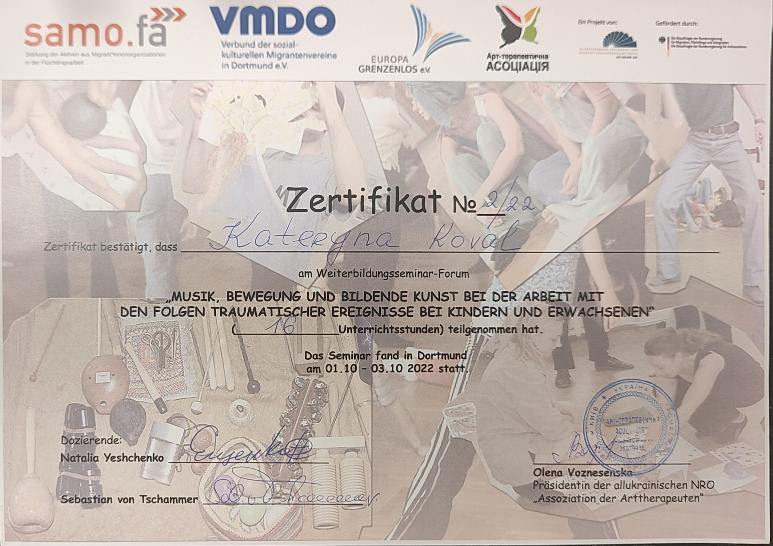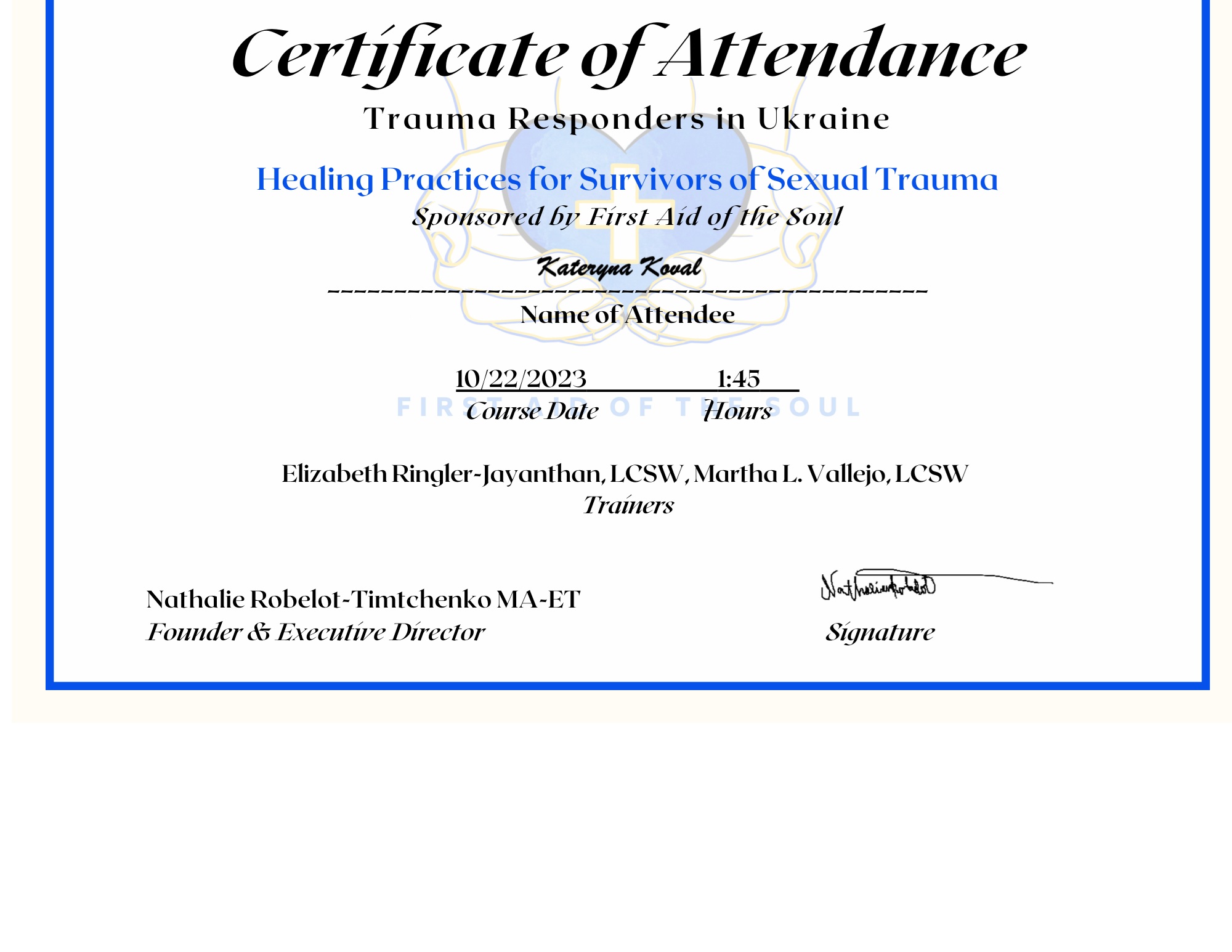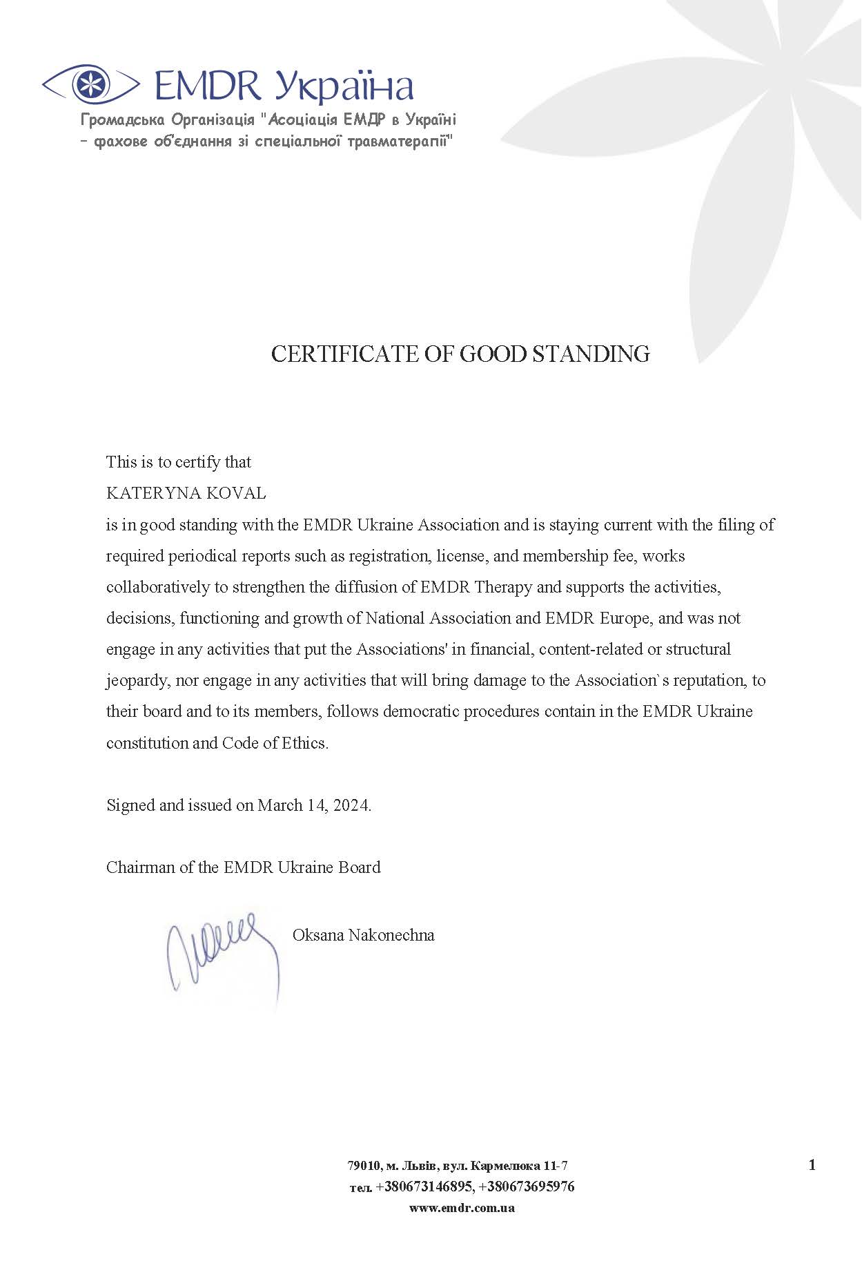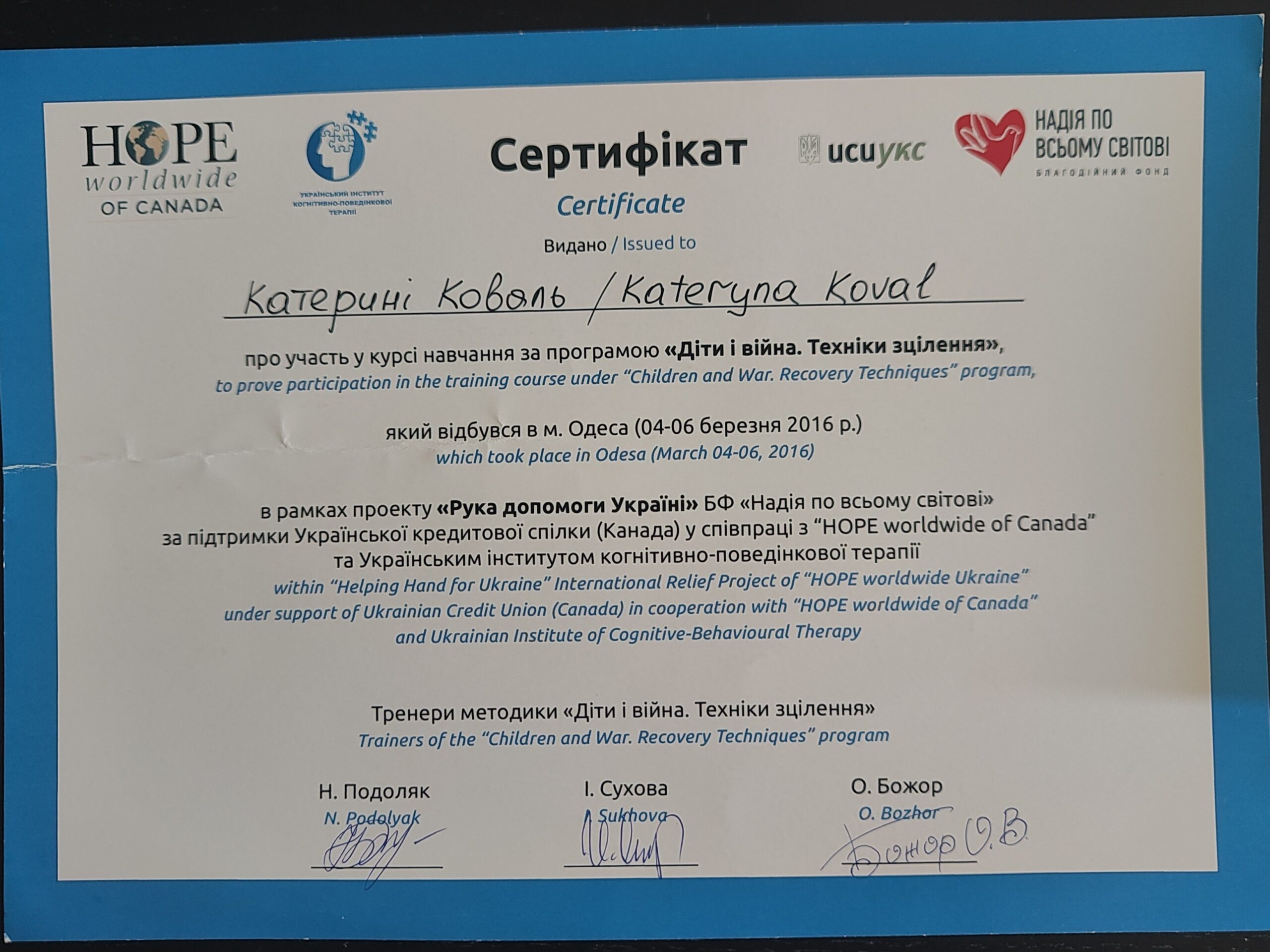 - Certified Trauma Therapist for Children & Adults (EMDR Ukraine), 2019
