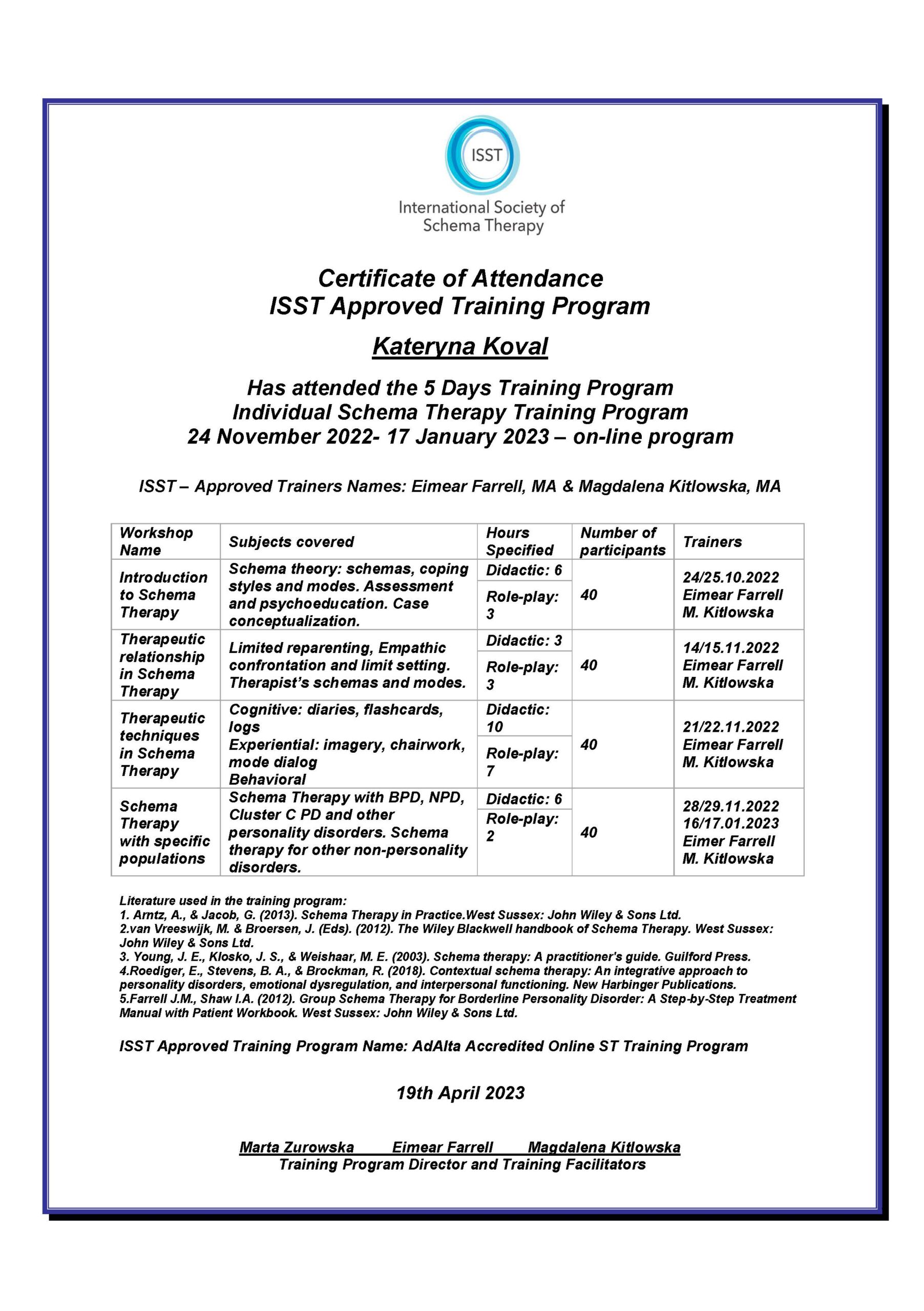 - Schema Therapy (ISST), 2023